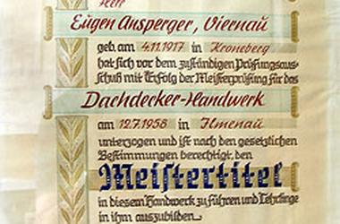 Gründung des Dachdeckerbetriebes durch Dachdeckermeister Eugen Ansperger Sanierung der ersten Dächer und Kirchtürme mit 2 Mitarbeitern